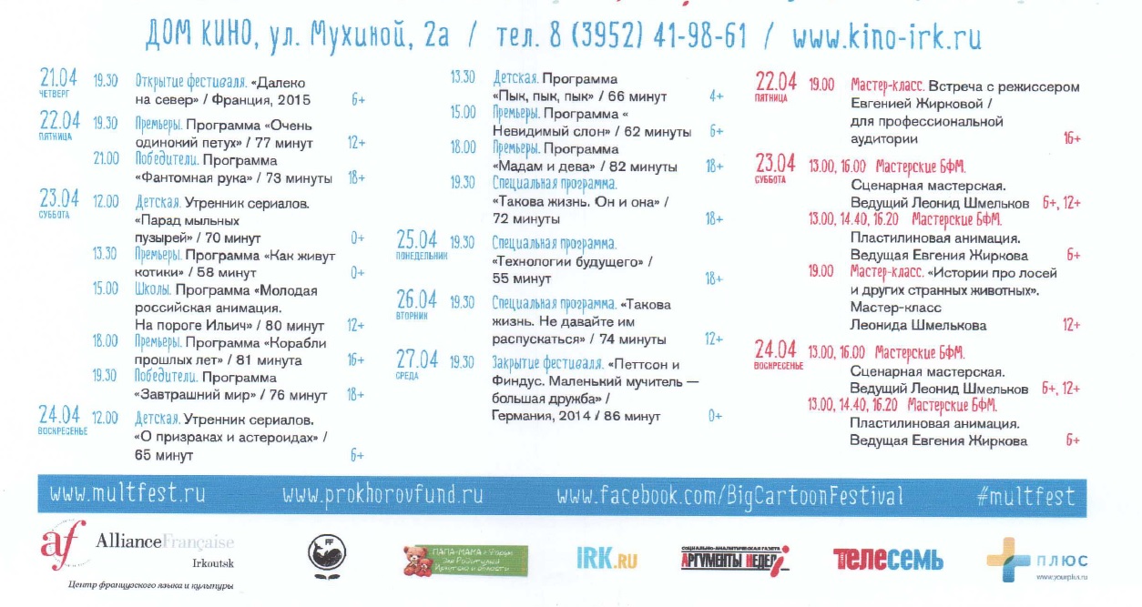 Более подробно с информацией о программе «Большого фестиваля мультфильмов» можно ознакомиться www.kino-irk.ru.