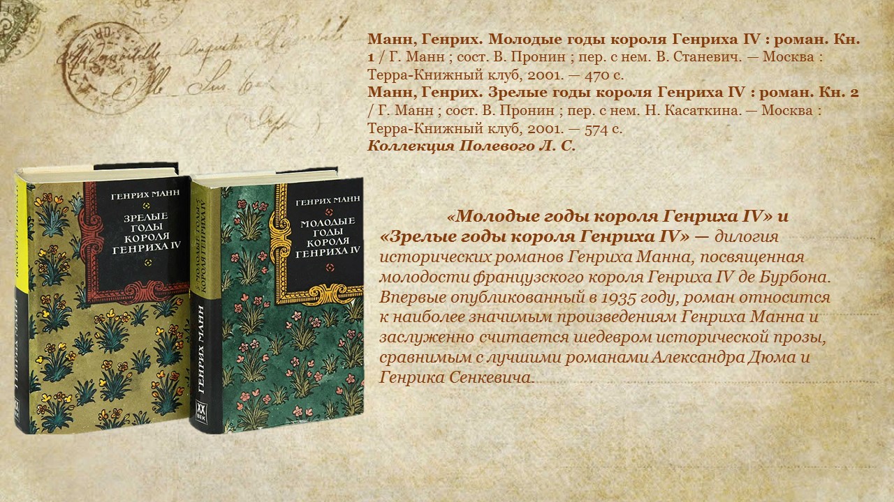 В фонде редких книг Гуманитарного центра-библиотеки имени семьи Полевых произведения Генриха Манна хранятся в коллекциях Полевого Леонида Сергеевича и Ножикова Юрия Абрамовича.